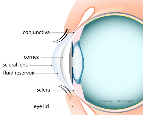 Scleral contact lenses are large-diameter lenses made of a special material that’s highly gas permeable (it lets oxygen through). In the strictest sense of the word, scleral lenses are not “contact” lenses because they do not make contact with the cornea. Instead, these lenses vault over the cornea, and the outer edges of the lens rests on the white of the eye (the sclera).